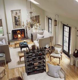 I adore the linen couches - they have a marked Belgian feel. Also note the French antique chairs and the Swedish style daybed. I like the use of black in what feels like a very neutral decor. The black tables and iron candlesticks are obvious,but also look at the french doors which are boldly painted black. Further inspection and we find iron curtain rods,  fireplace screen and a pie rack used as a room divider. I can't really make out what material the window shades are - is it an antique canvas? or an antique stenciled linen? In any case they are very unusual. I also find the mix of upholstery out of ordinary, but I like how it all works together.